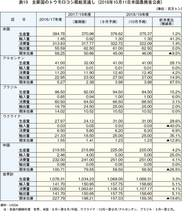 米国農務省海外農業局(USDA/FAS)が2018年10月11日に公表した「Grain:World Markets and Trade」によると、2018/19年度の世界のトウモロコシ生産量は、多くの主要生産国で前年を上回ることなどから、前年度比3.3%増の10億6831万トンと見込まれている(表19)。