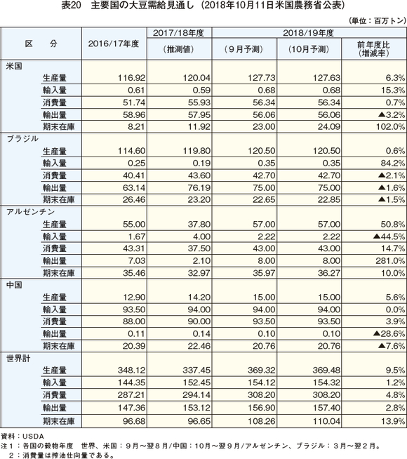 USDA/FASが10月11日に公表した「Oilseeds:World Markets and Trade」によると、2018/19年度の世界の大豆生産量は、主要生産国で増産が見込まれることに加え、前年度に干ばつの影響で減産となったアルゼンチンの反動などにより、前年度比9.5%増の3億6948万トンと見込まれている(表20)。