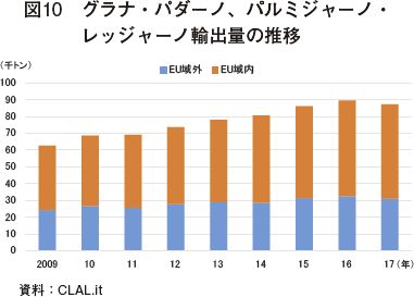 輸出量について、生産量の大きいグラナ・パダーノ、パルミジャーノ・レッジャーノと、ゴルゴンゾーラをみると、いずれも増加傾向で推移している(図10、図11)。なお、2017年は、グラナ・パダーノ、パルミジャーノ・レッジャーノは生産量の26%を、ゴルゴンゾーラについては、同35%をEU域内・域外へ輸出している。
