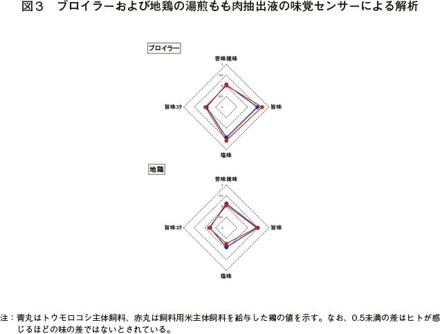 官能検査の結果、ブロイラーのもも肉の食味には飼料用米の給与による影響は認められなかった(図1)が、地鶏のもも肉においては肉の香り全体の強さが弱まる一方で、鶏肉らしい香りがやや強まる傾向、および脂っこさがやや弱まる傾向が示された(図2)。また、味覚センサーによる分析では呈味の差は認められなかった(図3)。ブロイラーにおいては、飼料用米の給与期間(3週間)が地鶏のそれ(7週間)に比べて短かったことから、食味に及ぼす飼料用米の影響が表れなかったのかもしれない。また、豚骨ラーメンを好む人もいれば、しょうゆラーメンを好む人もいるように、人によって鶏肉の嗜好も異なることから、今回認められた食味の変化は、必ずしも全ての消費者にとって望ましいものではないかもしれない。しかしながら、本研究によって、少なくとも鶏肉の食味は飼料用米による悪影響を受けないことが明らかになった。