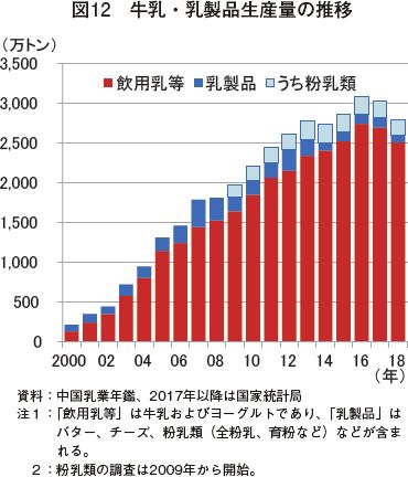 酪農・乳業は、畜産業の中でも草地資源を活用できる効率のよい産業であること、乳製品は国民の健康増進にも欠かせないとしていることから、政府は、1978年の改革解放以降、酪農業を重要産業に位置付け、発展を推進してきた。このため、生乳生産量は2000年に入り急増した。1998年には663万トンであったが、2008年には4.5倍の3010万 トンまで増加した(図2)。なお、2017年以降は、中央一号文書
