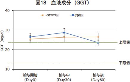 GGTはタンパク質分解酵素の一種で、肝細胞が破壊されると血中濃度が高まることから、肝臓障害の指標として用いられる。イネSGS区、対照区とも上限値をやや上回り推移し、対照区は給与後に適正値内に推移した(図18)。