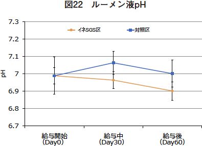 牛は反すう動物のため、第1胃(ルーメン)で微生物による発酵が盛んに行われ、そこで発生した揮発性脂肪酸をエネルギー源として利用している。そのため、ルーメン液性状はルーメン発酵の指標となる。イネSGS区、対照区ともルーメン発酵が良好に行われている目安となる酢酸の割合が高くなり(図21)、pHも適正範囲であるpH7.0前後で推移した(図22)。