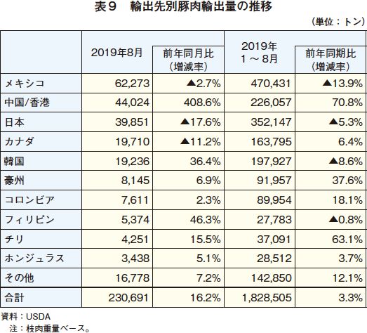 米国農務省経済調査局(USDA/ERS)が2019年10月7日に更新した「Livestock and Meat International Trade Data」によると、2019年8月の豚肉輸出量は23万691トン(前年同月比16.2%増)と前年同月を大幅に上回った(表9)。輸出先別にみると、最大輸出先であるメキシコは前年同月をわずかに下回る6万2273トン(同2.7%減)であったが、中国/香港向けは前年同月の5倍を上回る4万4024トン(同408.6%増)となった。この結果、中国/香港向けが同月の米国産豚肉輸出量に占める割合も前年同月を13.7ポイント上回る19.1%となり、日本を抜いて第2位の輸出先となった。この他、同月は韓国やフィリピンといった、日本を除くアジアの国々に対する輸出量も前年を大幅に上回る水準となった。