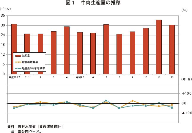 1 令和元年12月の牛肉生産量(部分肉ベース)は、3万348トン(前年同月比1.6%減)と前年同月をわずかに下回った(図1)。品種別では、和牛は1万5033トン(同0.1%減)と前年同月並みとなり、乳用種は7317トン(同1.2%減)とわずかに、交雑種は7643トン(同4.8%減)とやや、いずれも前年同月を下回った。