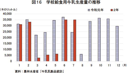 7月の牛乳生産量は、28万2839キロリットル(前年同月比5.8%増)と前年同月をやや上回った(農林水産省「牛乳乳製品統計」)。これを区分別に見ると、学校給食用は、新型コロナウイルス感染症(COVID-19)の影響により全国的に小中学校の夏休みが短縮されたことなどから、3万5035キロリットル(同43.0%増)と前年同月を大幅に上回った(図16)。また、業務用は2万3146キロリットル(同2.5%減)と引き続き前年同月をわずかに下回ったが、減少幅は前月からさらに縮まり、業務用需要が回復傾向にあることがうかがえる(図17)。