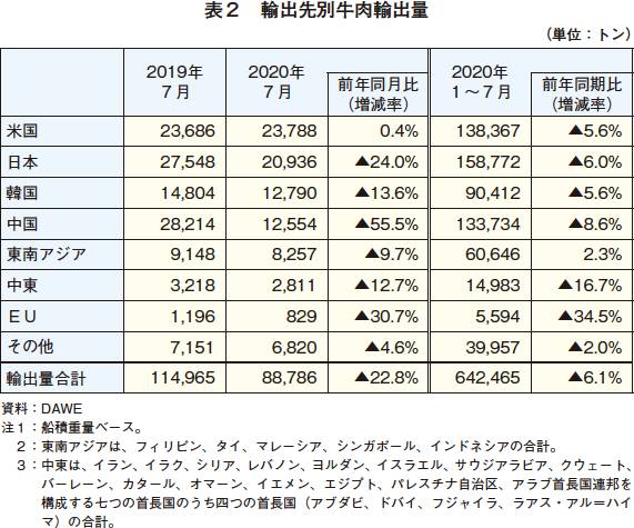 主要輸出先別に見ると、米国向けは、2万3788トン(前年同月比0.4%増)と主要輸出先で唯一前年同月並みを維持し、2カ月連続で最大の輸出先となった。これは、新型コロナウイルス感染症(COVID‐19)の影響で外食産業の再開状況が州により差が見られる状況の中、小売業が依然好調なためである。1〜7月累計では、COVID‐19により外食産業向けを中心に需要が大きく落ち込んだため、前年同期を5.6%下回った。