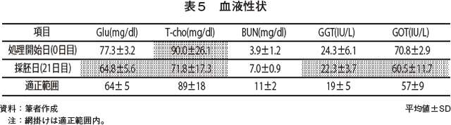 血液性状の結果を表5に示した。血中グルコース濃度(Glu)はエネルギー代謝の指標であり、適正範囲以外の牛群では一般的に繁殖性が悪いと言われる。処理開始日は適正範囲以上であったが、採胚日には適正範囲内であった。