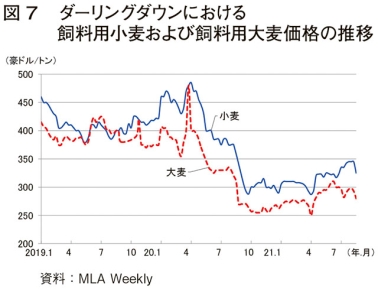 一方で飼料価格は、飼料穀物の育成に良好な天候が続いていることを背景に低水準で推移しており、QLD州南東部のダーリングダウン地域における9月10日時点の小麦価格は、1トン当たり325豪ドル(2万6650円)、大麦価格は同280豪ドル(2万2960円)と、いずれも前月割れとなっている(図7)。