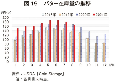 一方、8月のバターの期末在庫量は16万6448トン(同1.2%減)となり、26カ月ぶりに前年同月を下回った(図19)。これは、労働力不足により乳製品工場の稼働率が低下し、バターの生産量が減少したことに起因している。現地報道によると、カリフォルニア州では乳製品工場の労働力不足に加え、トラック運転手の不足もあり、バター生産量が減少したとされている。しかし、バター在庫量は、COVID-19流行前の2019年時の水準を大きく上回っている。