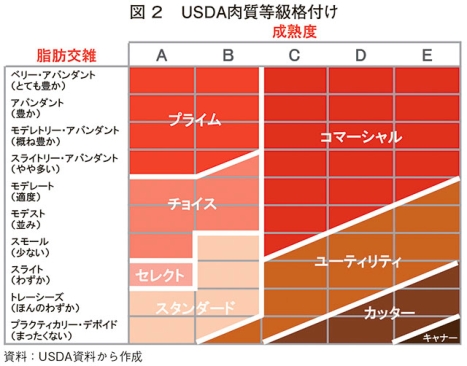 上述の通り、USDA肉質等級には八つのグレードがある。USDAの肉質等級を決定する検査官は、「アバンダント(豊か)」から「ディボイド(全くない)」までの10段階の脂肪交雑の度合いとAからEまでの枝肉の成熟度から評価を行うことにより、プライム、チョイス、セレクト、スタンダード、コマーシャル、ユーティリティ、カッター、キャナーの八つのグレードに分類する(図2)。検査官は、まず去勢牛、非去勢牛、未経産牛、経産牛といった牛の性別により、成熟度を大別する。