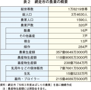 網走市が公表している「令和3年度あばしりの農業」によると、令和2年12月時点の農家人口は、1590人(総人口比4.6%)、農家戸数は320戸(総世帯比1.8%)である。農家戸数を経営体別に見ると、酪農は16戸、その他畜産は7戸、複合は13戸、畑作が284戸であり、畑作農家が全体の80%以上を占めている(表2)。