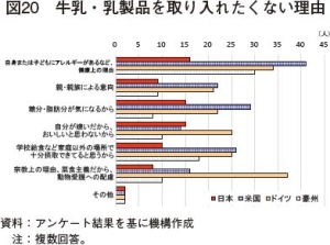 一方で、取り入れたくないと回答した者にもその理由を調査した(図3)。日本、米国、ドイツは「添加物を含む食品を子どもに食べさせたくないから」と回答した者が最も多く、中でも日本(155人)は米国(109人)、ドイツ(82人)と比べその数が突出した。また、各国とも塩分・脂肪分を気にしている回答者も多く、米国およびドイツ、豪州では「加工されていない食肉を食べさせたい」と回答した者も一定数あった。