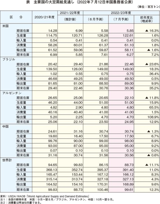 米国農務省世界農業観測ボード(USDA/WAOB)および米国農務省海外農業局(USDA/FAS)は2022年7月12日、2022/23年度の世界の大豆需給予測値を更新した(表)。