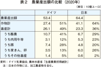 ドイツの農業産出額のうち約半分を畜産が占めるが、そのうち4割以上は酪農であり、同国農業における酪農の存在感、影響度合いは大きい(表2)。