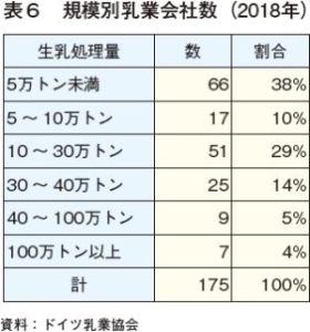 ドイツ国内の乳業会社については、年間100万トン以上の生乳を処理する企業が7社ある一方、年間5万トン未満の生乳を処理する企業も全体の40%近くを占める。これらは主に、チーズなど地域に根付いた製品を製造しているとみられる(表6)。