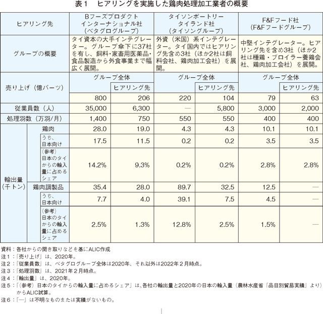 近年のタイの鶏肉業界、特に食鳥処理場では、労働環境の厳しさからタイ人の採用が進まず、外国人労働者が占める割合は過半数を優に超えているとされる。これら鶏肉業界など単純労働に従事する外国人労働者は、近隣3カ国(ミャンマー、ラオス、カンボジア)出身者が大多数を占めており、タイの鶏肉産業はこれらの国々からの外国人労働者によって支えられている。