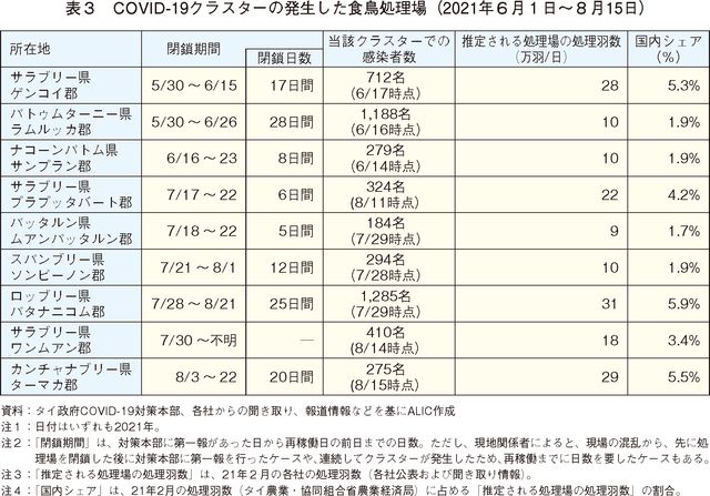 また、タイCOVID−19対策本部によると、同じく第3波中の同年6月1日〜8月15日には、食鳥処理場9カ所でクラスターが発生した(表3)。クラスターが発生した処理場は閉鎖され、消毒や感染管理対策を整備した後に稼働再開することとなるが、処理場閉鎖期間は1〜2週間程度であったという。また稼働再開後も、労働力不足や生産現場でのソーシャルディスタンス確保などの制限により、稼働率は通常時の1〜5割程度にとどまったとされる。