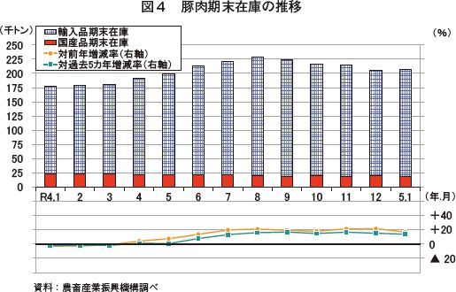 1月の推定期末在庫は、20万7204トン(同16.9%増)と前年同月を大幅に上回った(図4)。このうち、輸入品は、18万8666トン(同22.5%増)と前年同月を大幅に上回った。