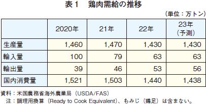 (注1)は前年比2.7%減の1430万トンとされ、23年も同程度の生産量が見込まれている(表1)。また、昨今のHPAIの発生により原種鶏の供給に支障が出ていることで、23年の鶏肉生産にも影響を及ぼすとみられている。