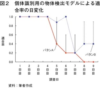 作成した個体識別用の物体検出モデルの精度を判断するための適合率、再現率およびF値の結果を図2〜4に示した。適合率において、パタンAは調査4日目まで良好であったが、その後、時間の経過とともに低下し、パタンBは調査6日目まで0.8〜1.0と良好であり、それ以降で低下した。再現率を見ると、両パタンとも調査3日目まで0.4程度であり、ID95鶏の誤検出や未検出があったが、パタンBは調査4日目に検出能力が0.8まで改善され、パタンAと明らかに傾向が異なっていた。F値に関して、両パタンとも調査3日目まで同様に推移し、パタンBは調査4日目で高まり、調査4日目以降でパタンAとパタンBの変化は大きく異なっていた。