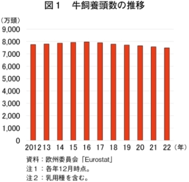 欧州委員会によると、2022年12月時点のEUの牛飼養頭数(EU27カ国)は、7485万5790頭(前年比1.1%減)と6年連続で前年を下回った(図1)。ここ数年の飼料や燃料などの生産コスト上昇の影響を受けて牛飼養頭数は減少基調にあり、欧州委員会はこの傾向が23年も続くと見込んでいる。