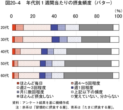 現在(22年9〜10月)の年代別の摂食頻度を見ると、牛乳およびヨーグルトは、全年齢の多くの者が摂食しており、特に、50代以下では過半数が習慣的(週2〜3回以上)に摂食する層が多く、また、年齢が若いほどその傾向が強いことが分かった(図20−1〜2)。チーズおよびバターも、比較的若い層での摂食頻度が高いことは共通していたが、20、30代でもほとんど摂食しない層も多く(チーズ:20、30代ともに4割、バター:同3割)、消費量が増加する余地を大いに感じさせる結果となった(図20−3〜4)。