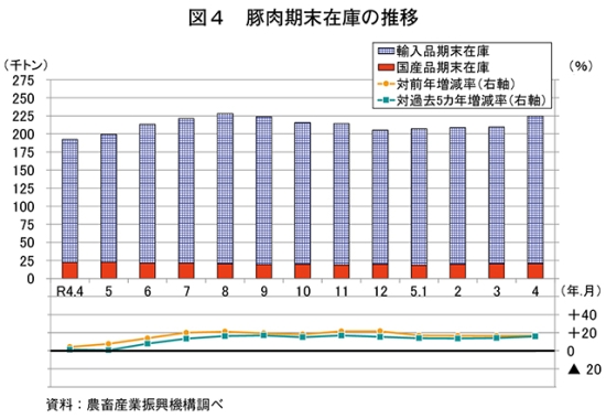 4月の推定期末在庫は、22万4618トン(同16.9%増)と前年同月を大幅に上回った(図4)。このうち、輸入品は、20万4045トン(同20.0%増)と前年同月を大幅に上回った。