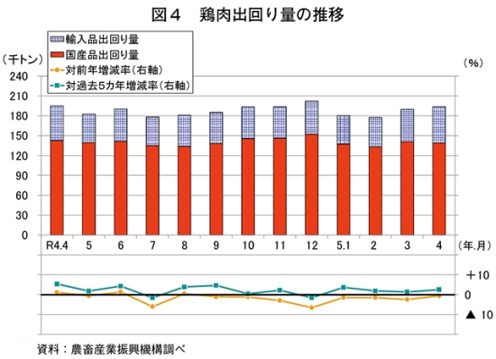 推定出回り量は、19万3782トン(同0.6%減)と前年同月をわずかに下回った(図4)。このうち、国産品は13万9020トン(同2.5%減)と前年同月をわずかに下回った一方、輸入品は5万4762トン(同4.5%増)と前年同月をやや上回った。
