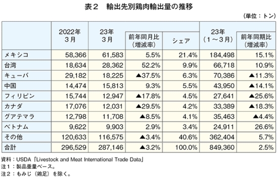 USDA/ERSによると、2023年3月の鶏肉輸出量は28万7146トン(前年同月比3.2%減)と前年同月をやや下回った(表2)。主要輸出先のメキシコ向け(同5.5%増)、台湾向け(同52.2%増)、中国向け(同9.3%増)は増加したものの、キューバ向け(同37.5%減)、フィリピン向け(同17.8%減)、カナダ向け(同29.5%減)などの減少が影響した。