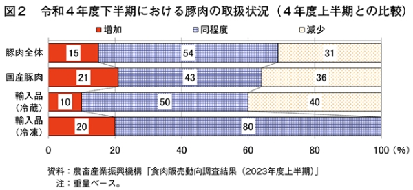 豚肉では、1位が「総菜や味付け肉の強化」、2位が「低級部位や切り落としを増やす」、3位が「差別化商品の取り扱いを増やす」となった。