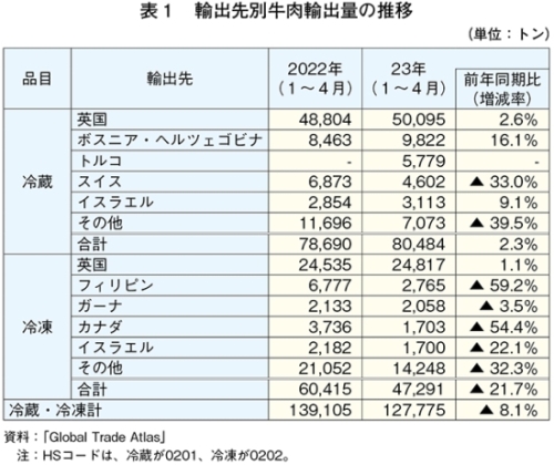 2023年1〜4月の牛肉輸出量は、前年同期比8.1%減の12万7775トンとかなりの程度減少した(表1)。欧州委員会は前述の見通しの中で、23年の牛肉輸出量は、供給量の減少を背景とした牛肉価格の高止まりで価格競争力が低下することにより、49万トン(前年比5.0%減)とやや減少すると見込んでいる。