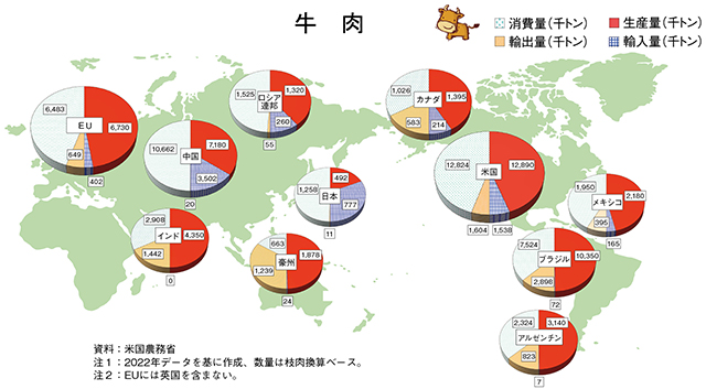 2022年の世界の牛肉生産量は、7626万トン(枝肉換算ベース、FAO Food Outlook、2023年6月)と見込まれる。主要生産国(国別データは米国農務省)は、米国(1289万トン)、EU(673万トン)などの先進国のほかに、ブラジル(1035万トン)、中国(718万トン)、インド(435万トン、水牛肉を含む)、アルゼンチン(314万トン)といった新興国である。牛肉消費量は、米国が世界最大の消費国であるが、中国の消費も増加している。一方、EUやロシア連邦など減少に転じたところも存在する。牛肉輸出量は、ブラジル(290万トン)、米国(160万トン)、豪州(124万トン)の順に多い。また、日本への輸出量が多い米国や豪州、カナダ(58万トン)の3カ国で全輸出量の約3割を占める。