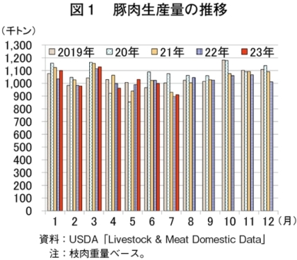 米国農務省全国農業統計局(USDA/NASS)によると、2023年7月の豚肉生産量は、1頭当たり枝肉重量が夏の高気温や飼料費高騰の影響で前年同月を下回ったものの、と畜頭数の増加により91万トン(前年同月比1.8%増)とわずかに増加した(図1)。また、同月の豚肉期末在庫は21万4900トン(同10.0%減)とかなりの程度減少した(図2)。現地情報によると、旺盛な外食、バーベキュー向け需要に加え、同年7月からカリフォルニア州法第12号(注1)が適用され、同州において飼養基準を満たさない母豚に由来する豚肉の販売が規制される中、7月1日時点ですでにと畜・食肉処理されていた豚肉は年末まで同州にて販売が可能なため出荷増となり、米国全体で在庫量が減少した可能性があるとしている。