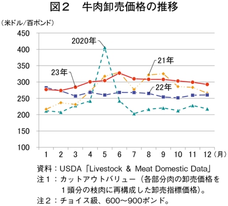 23年12月の牛肉卸売価格(カットアウトバリュー(注1))は、国内生産量が減少する中で需要が堅調であることから、100ポンド当たり292.52米ドル(1キログラム当たり958円:1米ドル=148.55円(注2)、前年同月比12.3%高)とかなり大きく上昇し、依然高値で推移している(図2)。