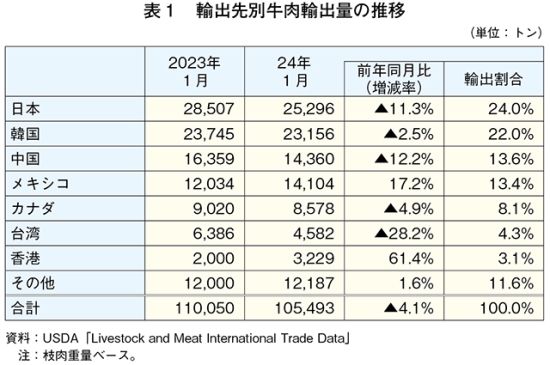 USDA/ERSによると、2024年1月の牛肉輸出量は10万5493トン(前年同月比4.1%減)とやや減少した(表1)。豪州産との競合や、アジア地域からの需要減が要因とみられる。輸出先別に見ると、日本向けは2万5296トン(同11.3%減)、続く韓国向けは2万3156トン(同2.5%減)、中国向けは1万4360トン(同12.2%減)といずれも減少した。一方、メキシコ向けは堅調な需要に加え、通貨が米ドルに対しペソ高で推移していることから1万4104トン(同17.2%増)と大幅に増加した。