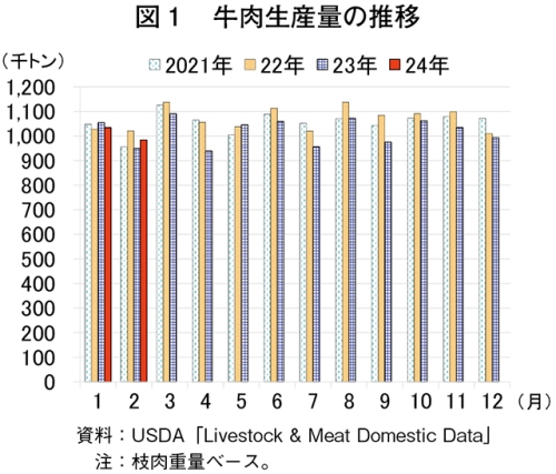 米国農務省全国農業統計局(USDA/NASS)によると、2024年2月の牛と畜頭数は、256万5000頭(前年同月比2.6%増)とわずかに増加した。この結果、同月の牛肉生産量は98万4000トン(同3.6%増)と前年同月をやや上回った(図1)。肥育牛価格の高騰に伴い繁殖雌牛が肥育に仕向けられたことなどによると畜頭数の増加や、肥育期間の長期化による平均枝肉重量の増加が要因とみられる。これを踏まえUSDAは、24年の牛肉生産量予測を前月から6万4000トン上方修正し、1194万1000トン(前年比2.4%減)とした。