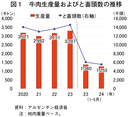 アルゼンチン経済省によると、2024年1〜5月の牛と畜頭数は551万3000頭(前年同期比8.3%減)、牛肉生産量は125万5000トン(同7.8%減)といずれも前年同期をかなりの程度下回った(図1)。これは、23年に70年ぶりといわれる厳しい干ばつに見舞われ、淘汰が進みと畜頭数が増加した結果、24年にと畜対象となる個体数の減少につながったことに加え、天候の回復に伴う飼養環境の改善から、肉用牛生産者による牛の保留傾向が強まったためとみられる。また、この間にと畜した1頭当たり平均枝肉重量は、227.5キログラム(同0.6%増)となった。