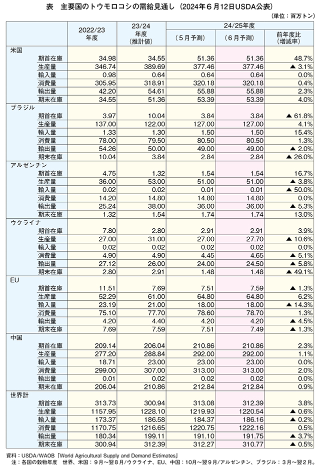 米国農務省世界農業観測ボード(USDA/WAOB)および米国農務省海外農業局(USDA/FAS)は、2024年6月12日、2024/25年度の世界のトウモロコシ需給予測値を公表した(表)。