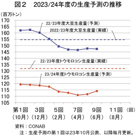ブラジル国家食糧供給公社(CONAB)は6月13日、2023/24年度第9回目となる主要穀物の生産状況等調査結果を公表した(表、図1〜2)。この調査は、春植えの夏期作物(大豆、第1期作トウモロコシなど)や秋植えの冬期作物(第2期作・第3期作トウモロコシ、小麦、大麦、ライ麦など)の生産予測を毎月公表するものである。