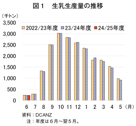 ニュージーランド乳業協会(DCANZ)によると、2024/25年度(6月〜翌5月)の幕開けとなる6月の生乳生産量は22万8000トン(前年同月比1.7%減)とわずかに減少し、4カ月連続で前年同月を下回った(図1)。この要因についてニュージーランド証券取引所(NZX)は、昨シーズン終盤の干ばつ傾向により、一部の地域で生乳生産の出足が鈍かったためとしている。実際に6月の牧草の生育状況を見ると、北島は平年を上回る成長率であったが、南島では土壌の乾燥が続いたため、6月後半には牧草生育指数(PGI)(注1)が大きく低下している。今後の生乳生産の見通しとしては、7月は前年同月比0.2%減となるものの、8月以降は牧草の生育が回復することで前年同月を上回って推移すると予測している。