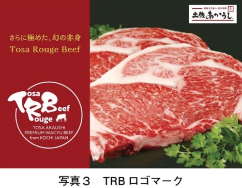 これがTosa Rouge Beef(トサ ルージュ ビーフ)、略して「TRB」規格です(写真3)。サシが少ないと言われる、肉質等級が2〜3等級の土佐あかうしの中から「ロース芯の大きさ」「皮下脂肪の薄さ」に注目し、併せてロース芯の形や筋間脂肪、土佐あかうしらしい小サシの具合、出荷月齢などの規格補正を加え、その品質が標準より良いものを「R4」、さらに良いものを「R5」として再評価する取り組みを令和2年度からスタートさせました。