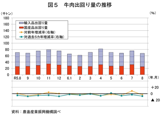 推定出回り量は、6万7761トン(同3.9%減)と前年同月をやや下回った(図5)。このうち、輸入品は4万2336トン(同4.3%減)、国産品は2万5425トン(同3.2%減)と、ともに前年同月をやや下回った。