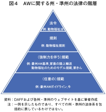 (注4)に位置する関連規則や規範では、各州・準州の特徴(家畜生産の規模など)に合わせた独自の規制も多く見られる(図4)。