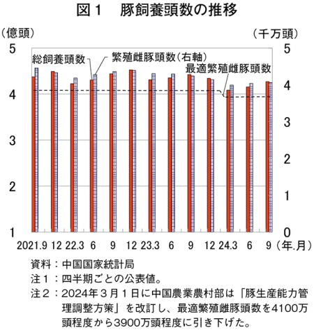 中国農業農村部によると、2024年9月末時点の繁殖雌豚頭数は4062万頭(前年同月比4.2%減)と前年同月をやや下回った(図1)。同頭数は、同部が最適な水準としている3900万頭を約4.2%上回っている。