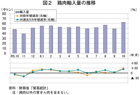 令和6年10月の鶏肉生産量は、14万7681トン(前年同月比1.5%増)と前年同月をわずかに上回った(図1)。