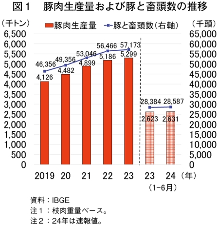 ブラジル地理統計院(IBGE)によると、2024年1〜6月の豚肉生産量は263万1000トン(前年同期比0.3%増)と前年同期並みになった(図1)。また、と畜頭数は2858万7000頭(同0.7%増)とわずかに増加した。