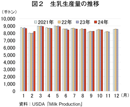 24年の生乳生産量についてUSDAは、前月予測から9万トン引き上げ、1億251万トン(前年比0.2%減)と見込んでいる。
