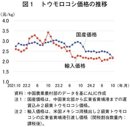 輸入トウモロコシ価格を見ると、主要養豚生産地の中国南部向け飼料原料集積地となる広東省黄埔港到着(関税割当数量内:1%の関税+25%の追加関税)は、24年10月が1キログラム当たり2.16元(46円:1元=21.10円(注)、前月同)となった。また、同月の国産トウモロコシ価格(東北部産の同港到着価格)が同2.20元(46円、前月比6.0%安)とかなりの程度下落したことで、輸入と国産の価格差は前月の同0.18元(4円)から同0.04元(1円)に縮小した。
