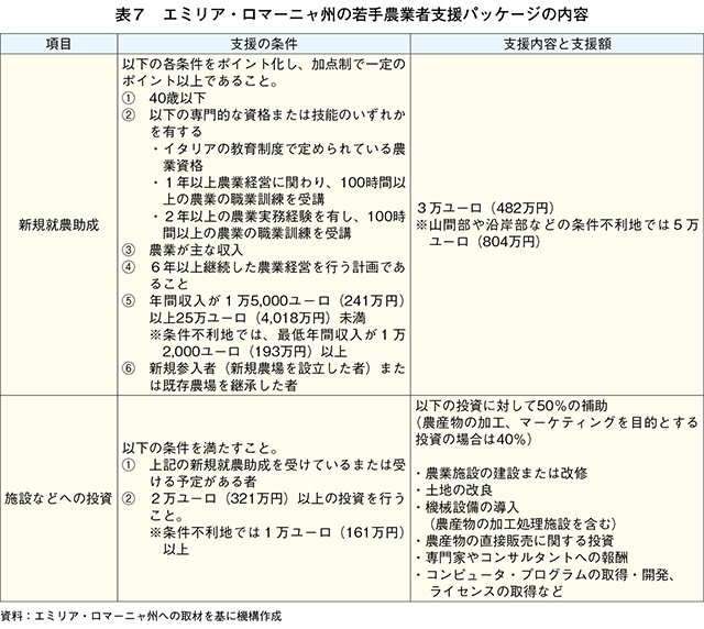 酪農などが盛んなイタリア北部のエミリア・ロマーニャ州(図8)では、2014〜22年にかけて、新規就農を希望する若者のための支援として、CAP予算などを活用して新規就農助成と施設の改修や機材の購入などの投資への支援が行われた(表7)。